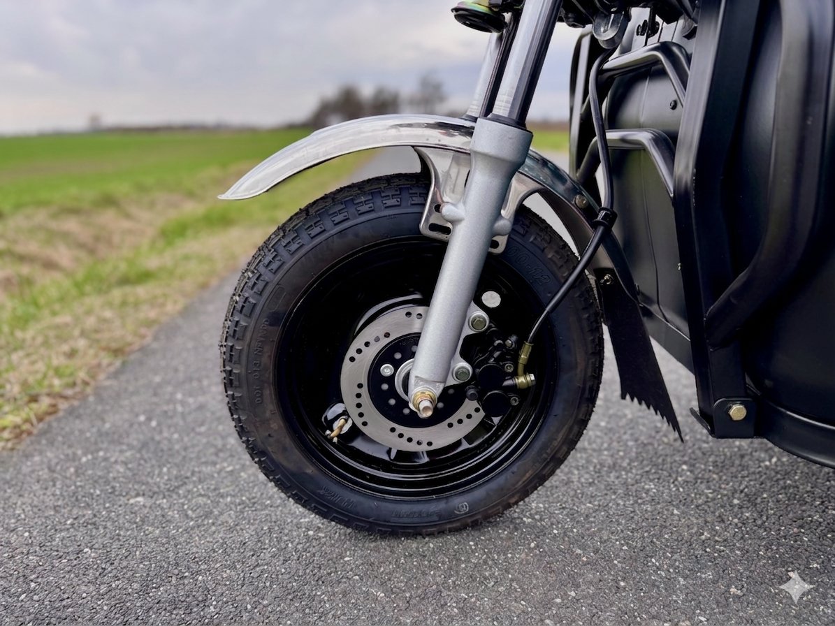Tříkolka je vybavena několika bezpečnostními prvky, včetně kotoučových brzd na předních i zadních kolech, což zajišťuje efektivní brzdění. Dále je vybavena LED osvětlením pro lepší viditelnost za snížené viditelnosti. Bezpečnostní prvky jsou zásadní pro ochranu řidiče a ostatních účastníků silničního provozu.