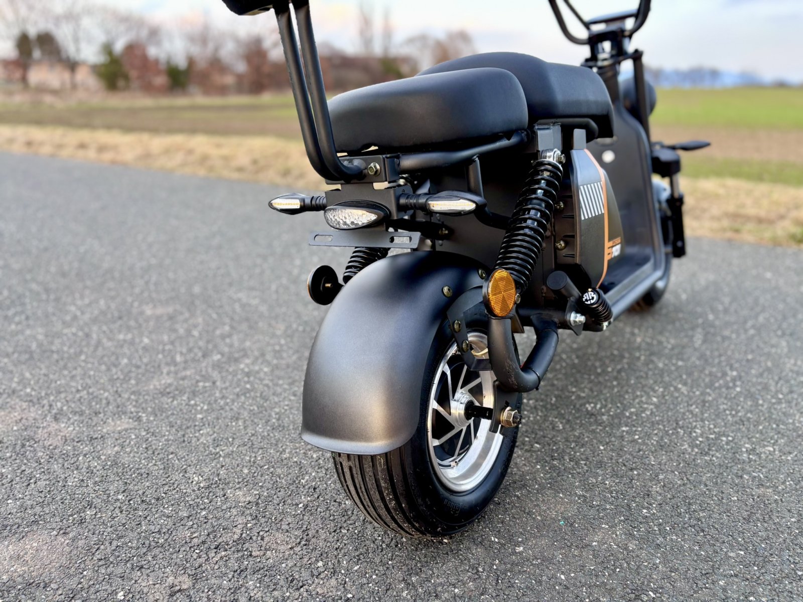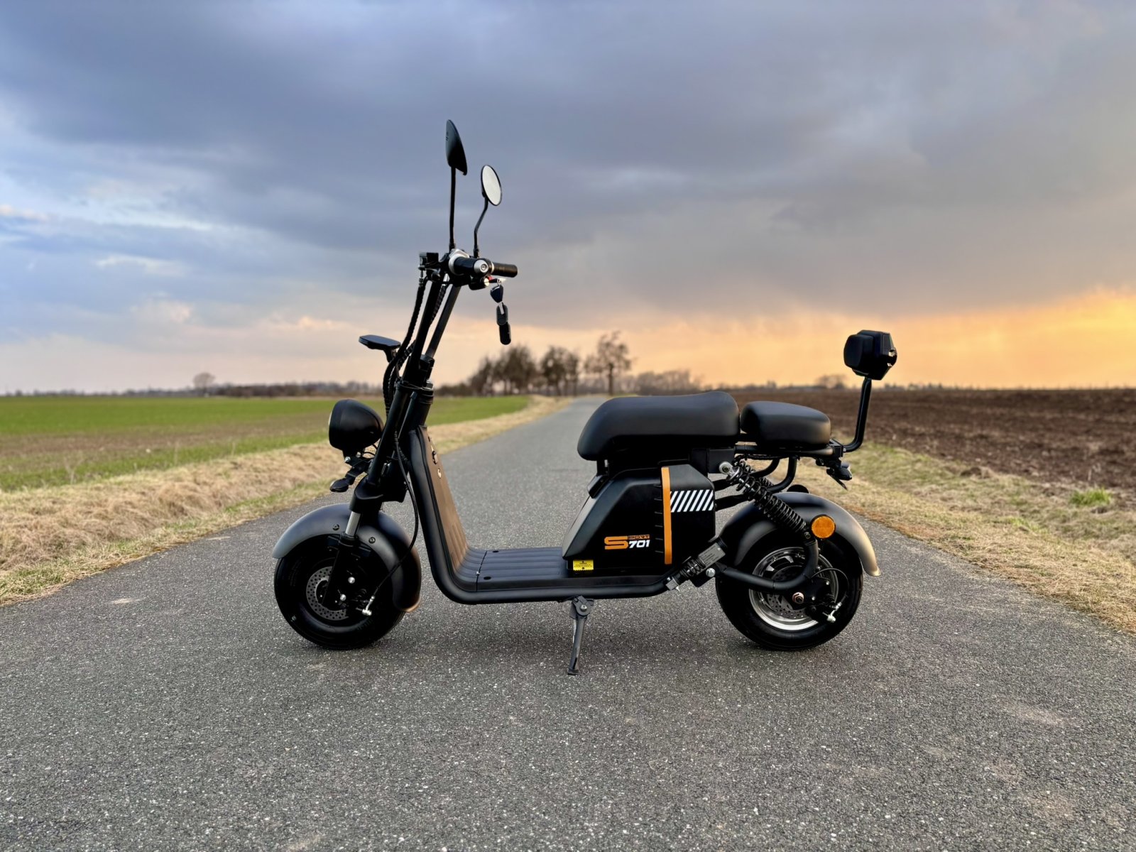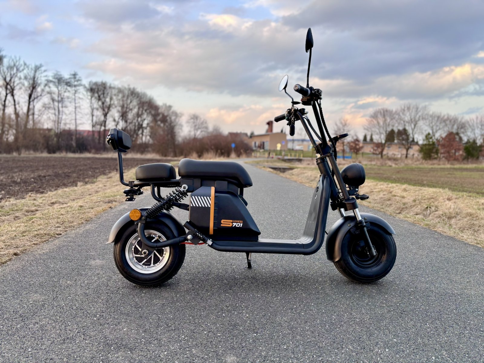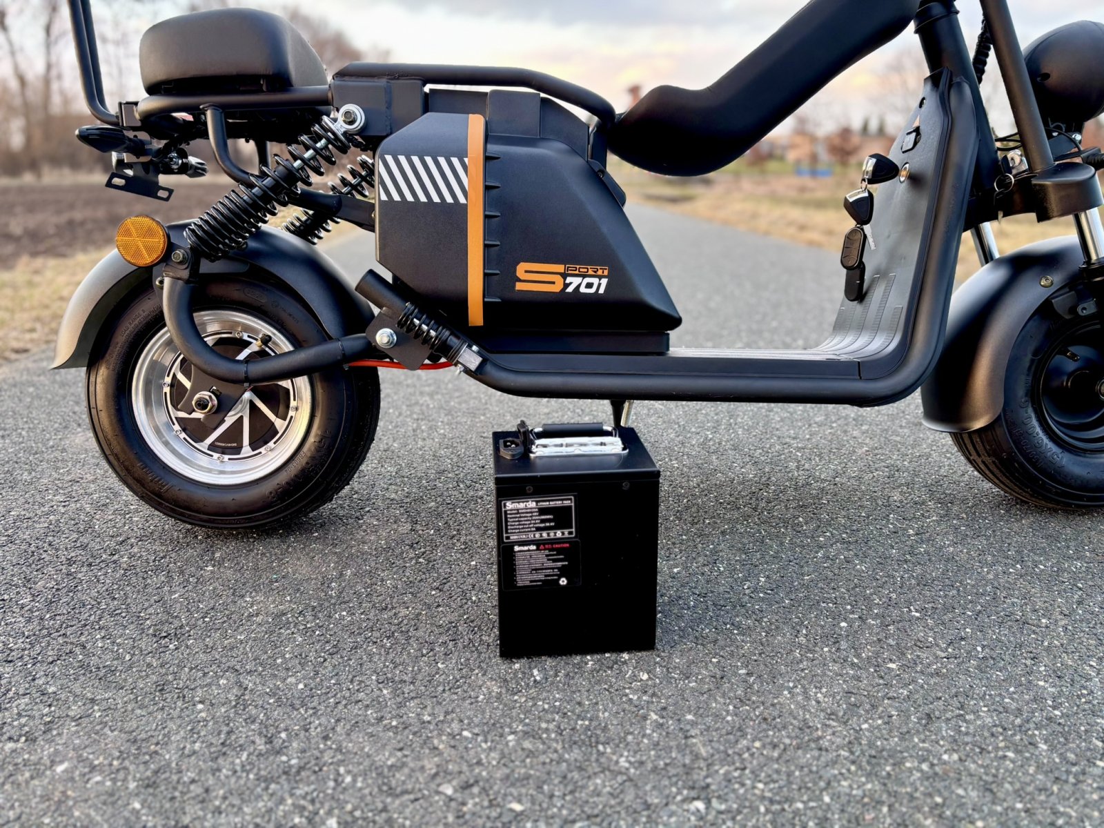V ceně zrcátka a zadní opěrku, která se v mnohých případech připlácí. Krásně zpracované blinkry ve stylu Audi. Displej ukazuje blinkry, stav baterie, rychlost, počet kilometrů. Alarm a klakson je je již v ceně. Dálkovým ovládáním je možné koloběžku zamknout/odemknout na dálku. LED osvětlení je montováno v blinkrech, zadním světle, brzdovém světle, v předním a dálkovém světle. Výhodou je dlouhá životnost osvětlení a malá spotřeba baterie. V ceně je také samozřejmě baterie a nabíječka.