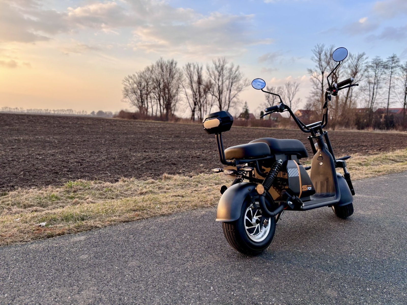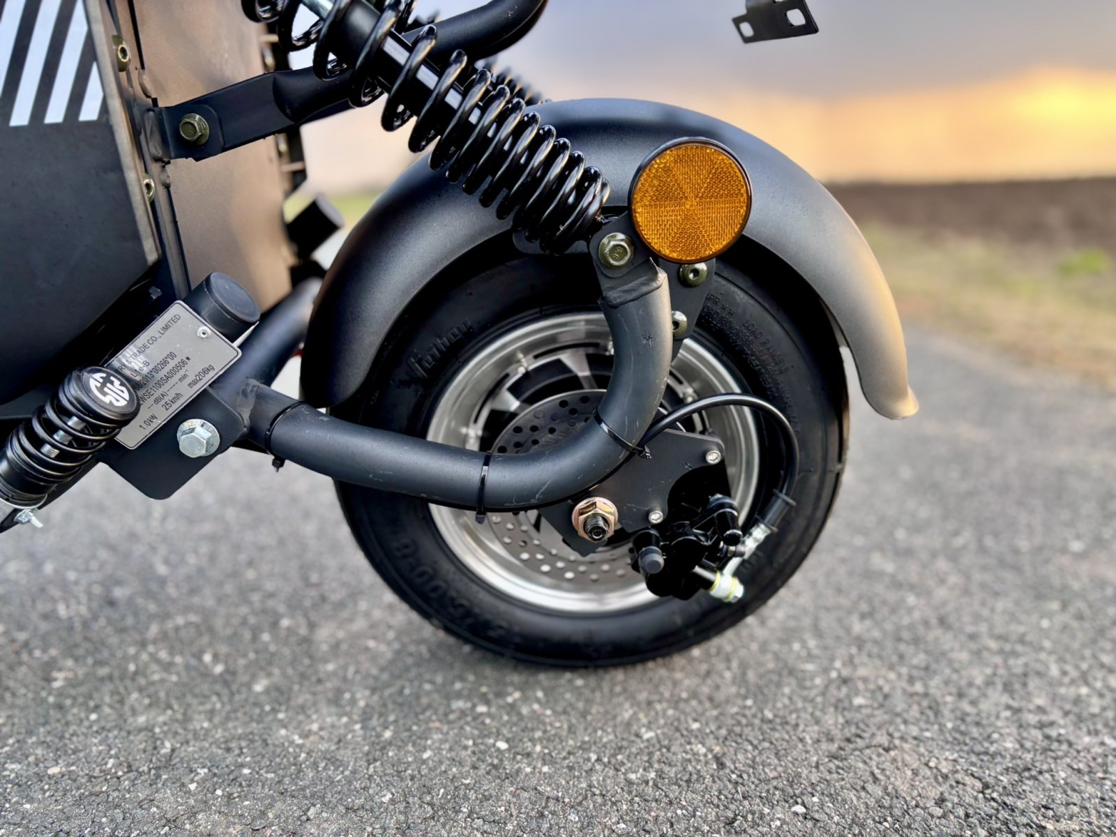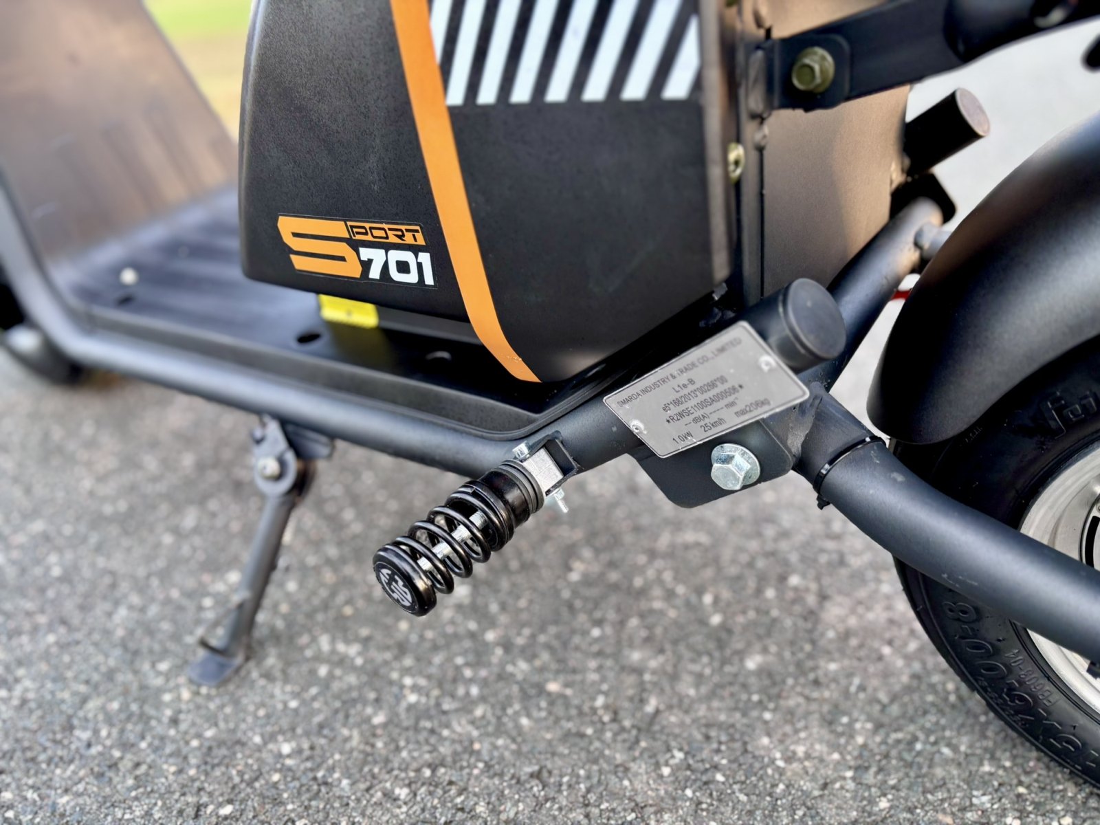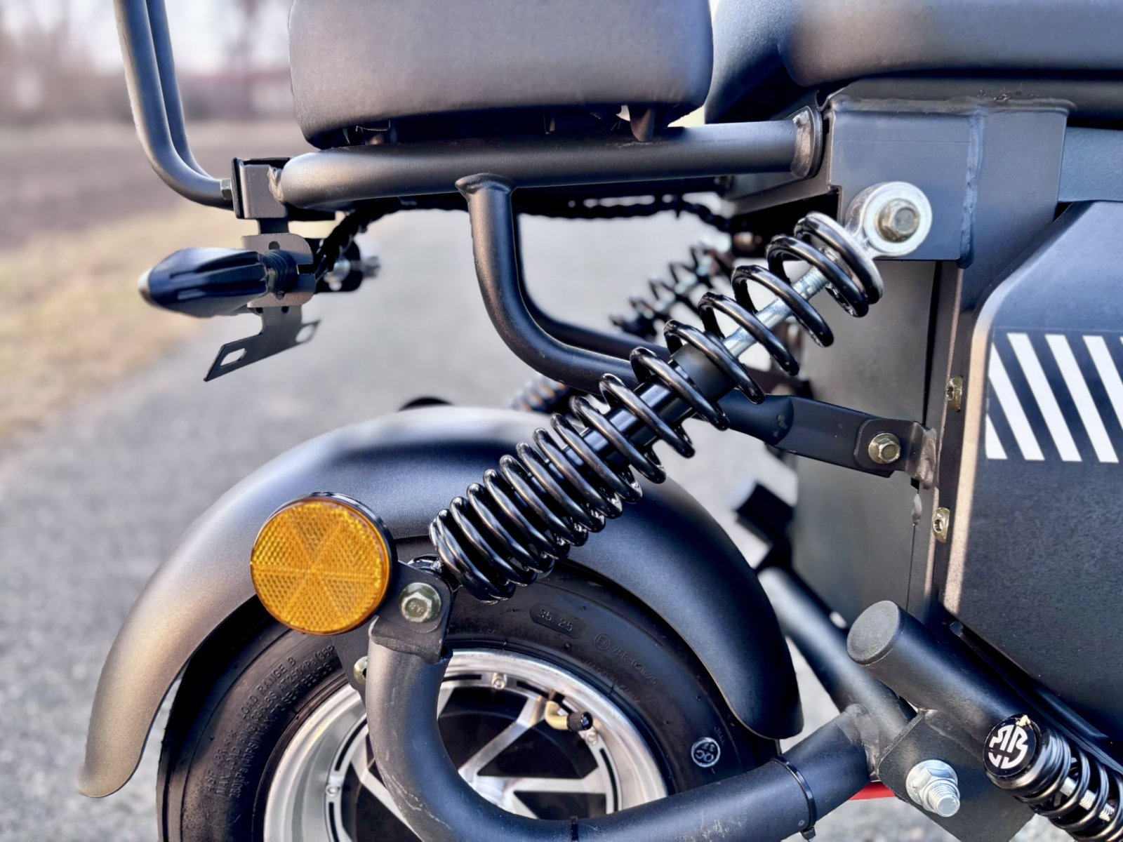 V ceně zrcátka a zadní opěrku, která se v mnohých případech připlácí. Krásně zpracované blinkry ve stylu Audi. Displej ukazuje blinkry, stav baterie, rychlost, počet kilometrů. Alarm a klakson je je již v ceně. Dálkovým ovládáním je možné koloběžku zamknout/odemknout na dálku. LED osvětlení je montováno v blinkrech, zadním světle, brzdovém světle, v předním a dálkovém světle. Výhodou je dlouhá životnost osvětlení a malá spotřeba baterie. V ceně je také samozřejmě baterie a nabíječka.