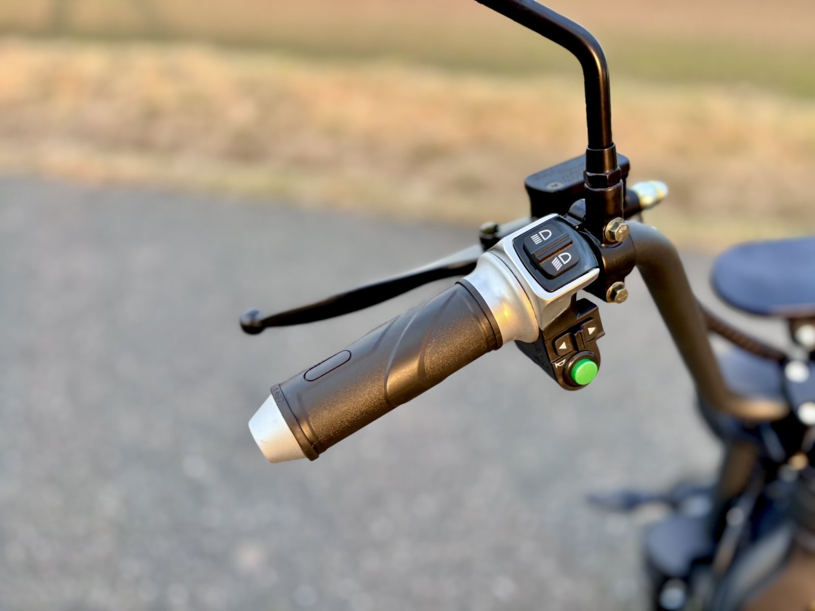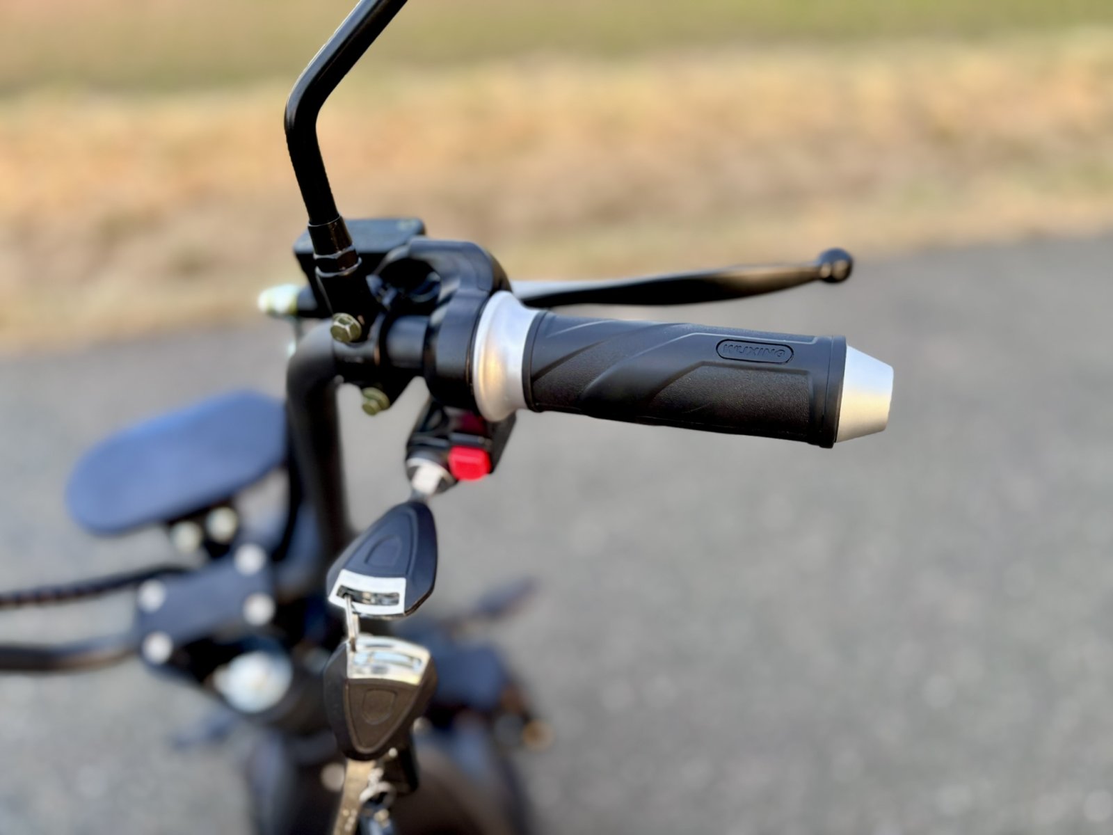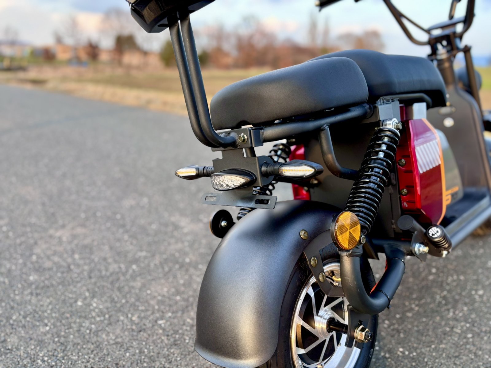V ceně zrcátka a zadní opěrku, která se v mnohých případech připlácí. Krásně zpracované blinkry ve stylu Audi. Displej ukazuje blinkry, stav baterie, rychlost, počet kilometrů. Alarm a klakson je je již v ceně. Dálkovým ovládáním je možné koloběžku zamknout/odemknout na dálku. LED osvětlení je montováno v blinkrech, zadním světle, brzdovém světle, v předním a dálkovém světle. Výhodou je dlouhá životnost osvětlení a malá spotřeba baterie. V ceně je také samozřejmě baterie a nabíječka.