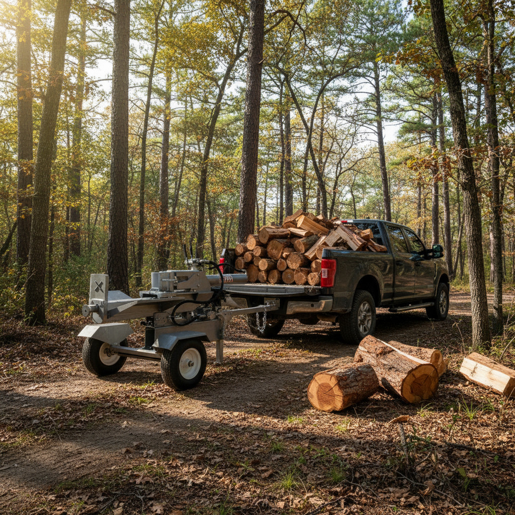 - Snadná manipulace: Kvalitní bezdušové pneumatiky a praktické tažné zařízení umožňují štípačku pohodlně připojit za čtyřkolku nebo traktor a snadno ji přemístit, kam potřebujete.